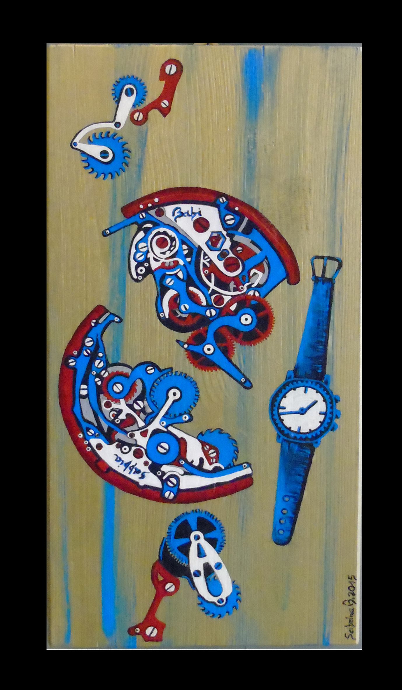 Quadro in legno di abete dipinto in acrilico, su fondo grigio, di colore rosso verde azzurro etc., il disegno rappresenta l\\\'ingrandimento del meccanismo di un orologio completo dei suoi elementi , con l\\\'aggiunta di orologi da polso. |