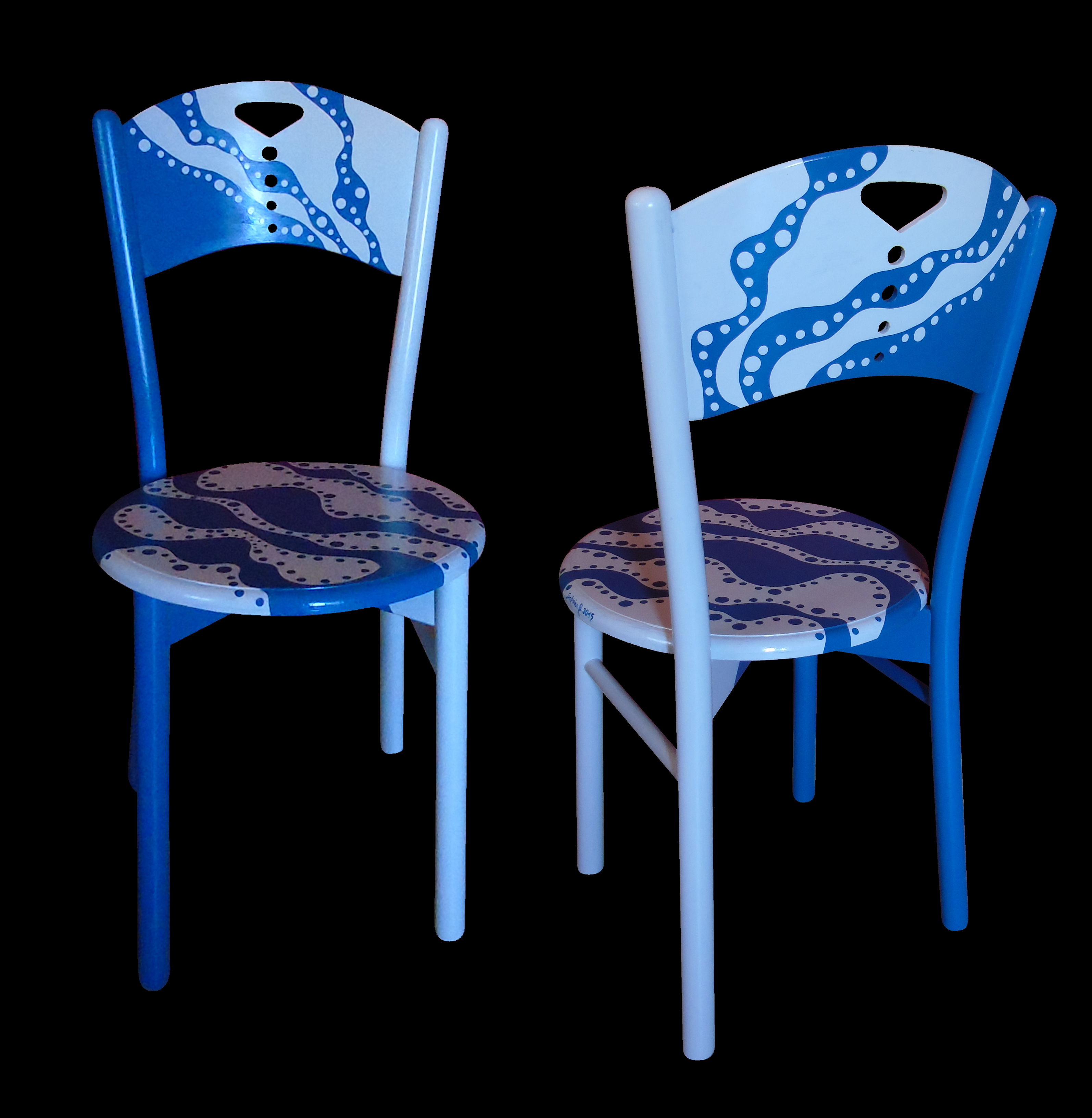 Sedia da cucina in legno, dipinta in acrilico e smalto, di colore azzurro e bianco perla, il colore azzurro crea forme curvilinee sulla seduta e sullo schienale, con l\'aggiunta di forme rotonde, azzurre e bianche che riprendono la lavorazione dello schie |