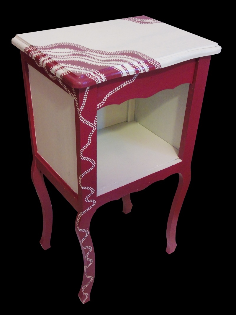 Tavolino in legno con cassetto, di colore bianco con disegno in rosso puntinato di bianco. |