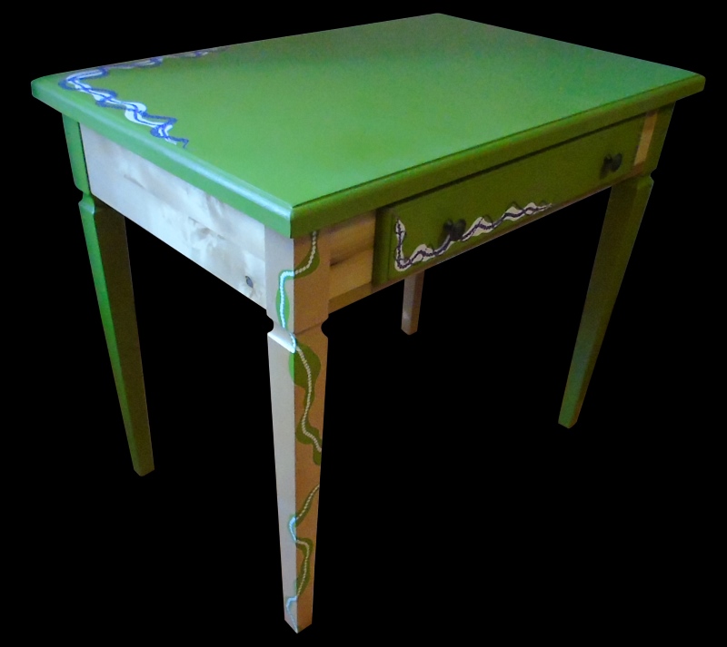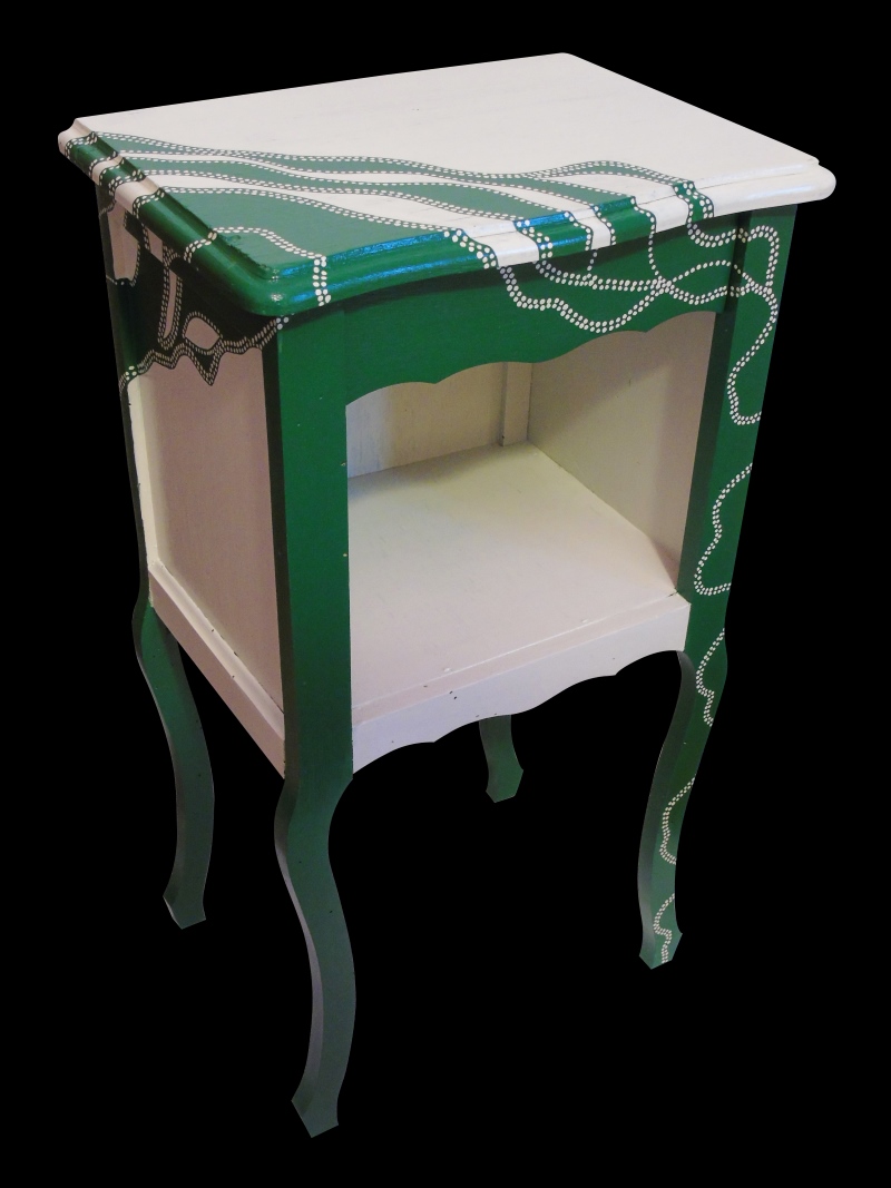 Tavolino in legno con cassetto di colore bianco con disegno verde e bianco. |