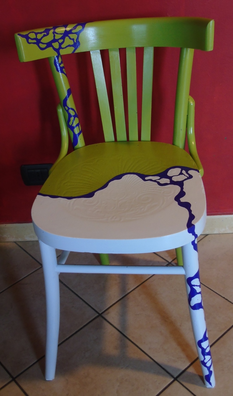 Sedia originale in legno, in stile Liberty, dipinta in acrilico e smalto di colore bianco e verde, con disegno curvilineo viola |