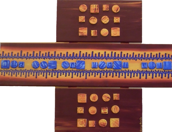 Assemblaggio di 3 tavole in legno di pino dipinto in acrilico, con formelle in das. Le incisioni all'interno delle formelle rimandano sia alla forma geometrica delle stesse che allo schema di applicazione |