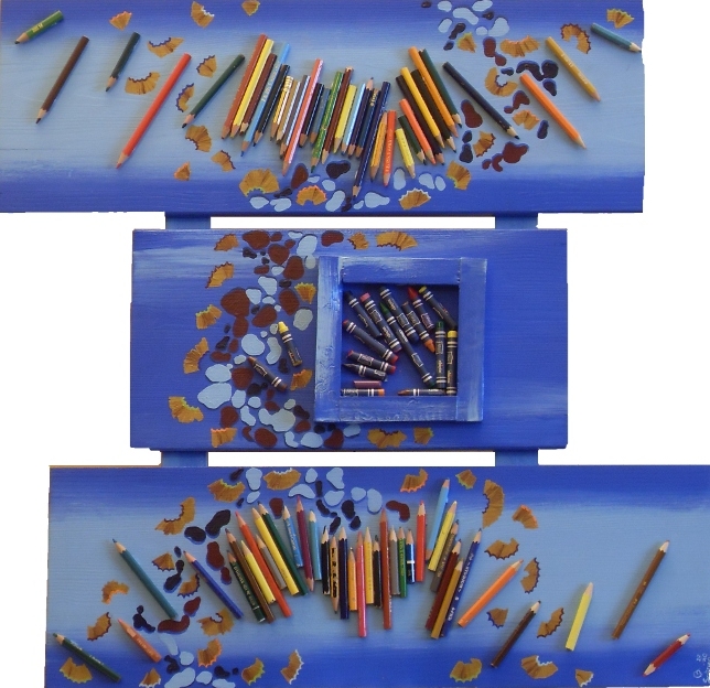 Fantasia di matite colorate usate e pastelli a cera su 3 tavole di legno di abete unite.