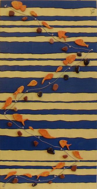 Piccoli pesci in das e pietre di fiume levigate su tavola in legno di abete, seguono una traccia di filo d'acciaio |