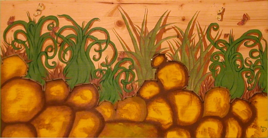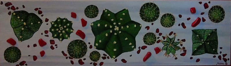 Rappresentazione su pannello di legno d\'abete, di svariate piantine grasse dipinte in acrilico, contornate da sassolini rossi, veri e finti dai colori brillanti. |