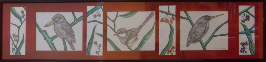 Composizione divisa in diversi settori, con figure di uccelli e di vegetazione, dipinti a matita con tratti a pastello su fogli di carta |