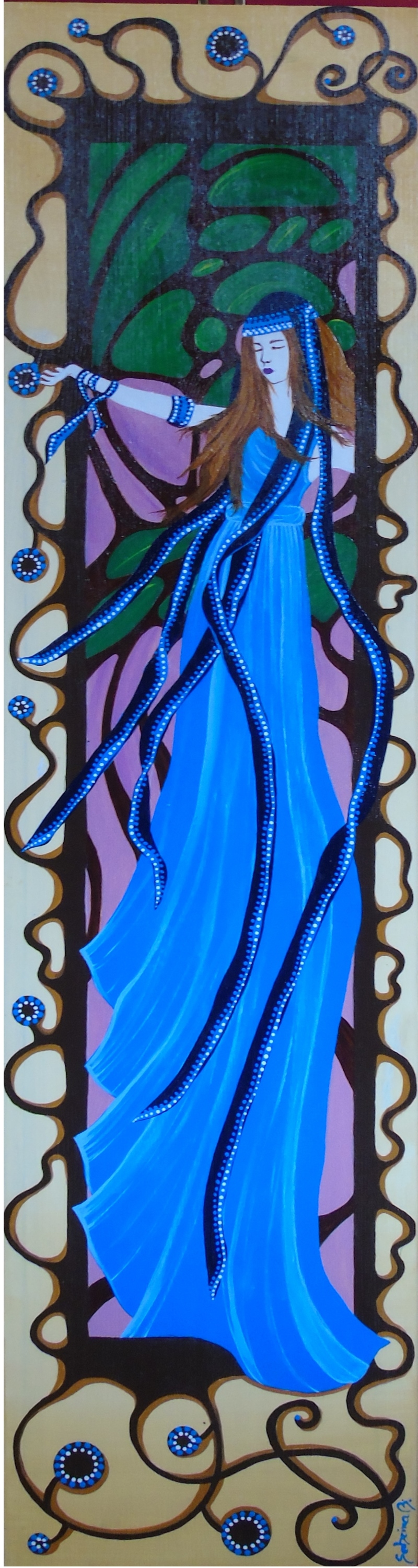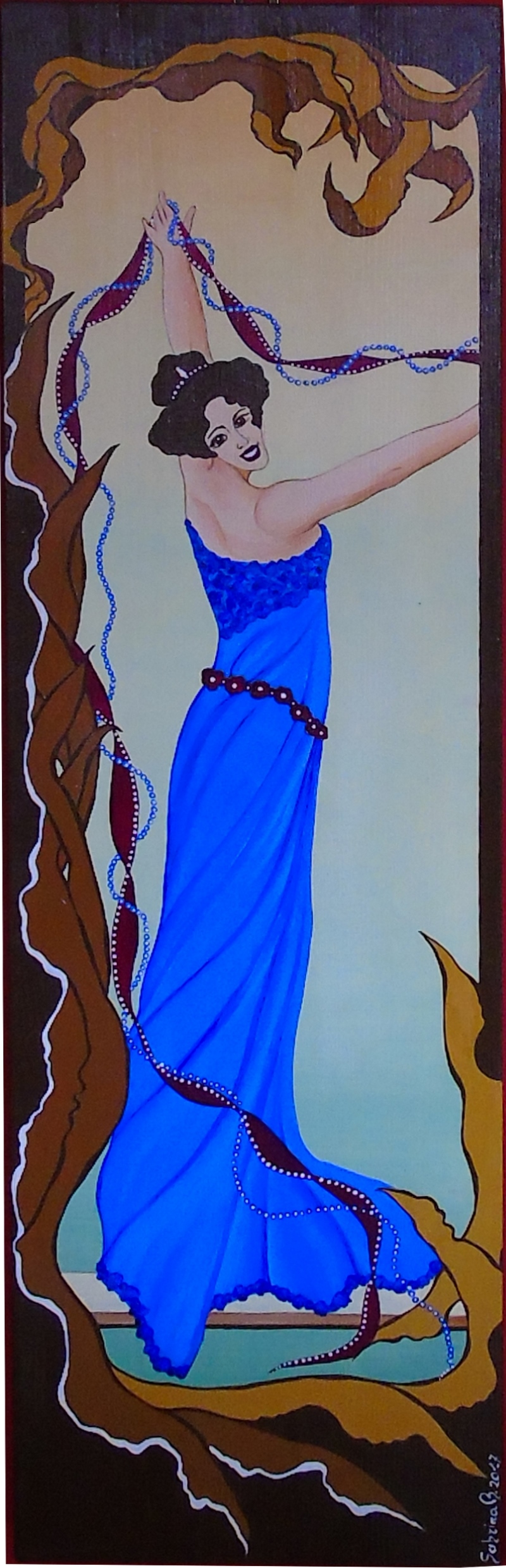 Rappresentazione su pannello in legno d\'abete, di una figura femminile, la danzatrice in cornice, realizzata in acrilico in stile Liberty. |
