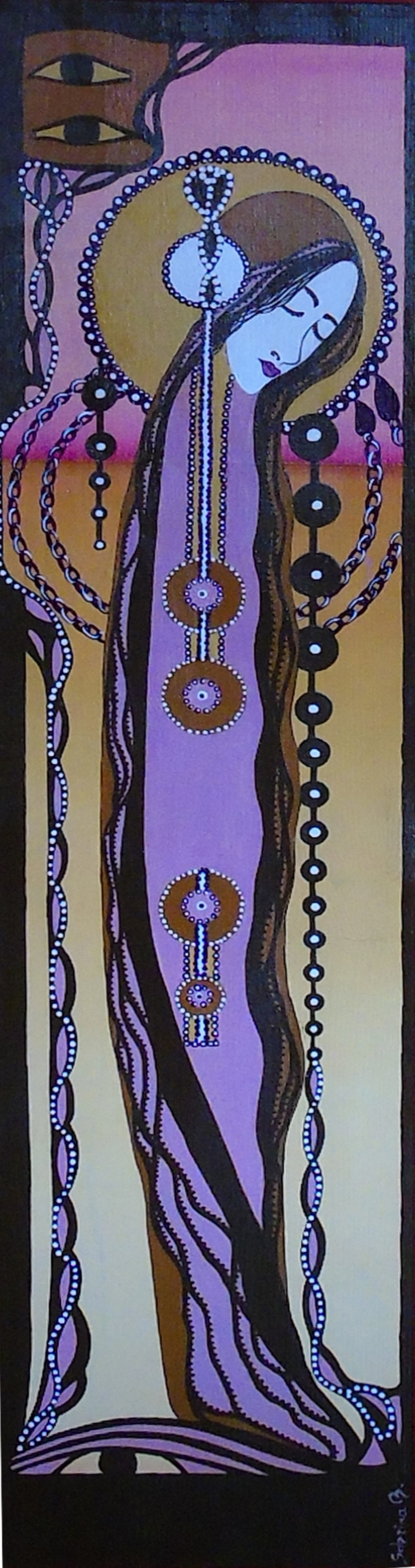 Rappresentazione su pannello di legno in abete, di una figura femminile, dall\'abito lungo denominata la Regina, realizzato in acrilico dai colori brillanti. |