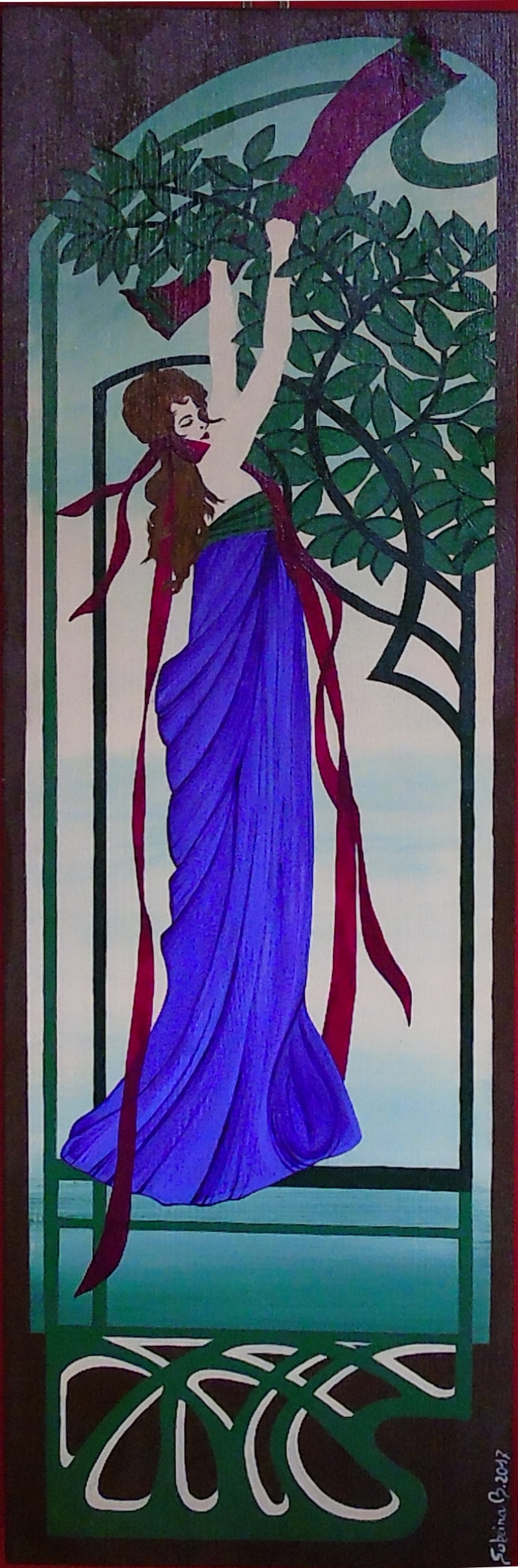 Rappresentazione su pannello in legno d\'abete, di una figura femminile che danza con un nastro colorato, realizzato in acrilico in stile Liberty. |