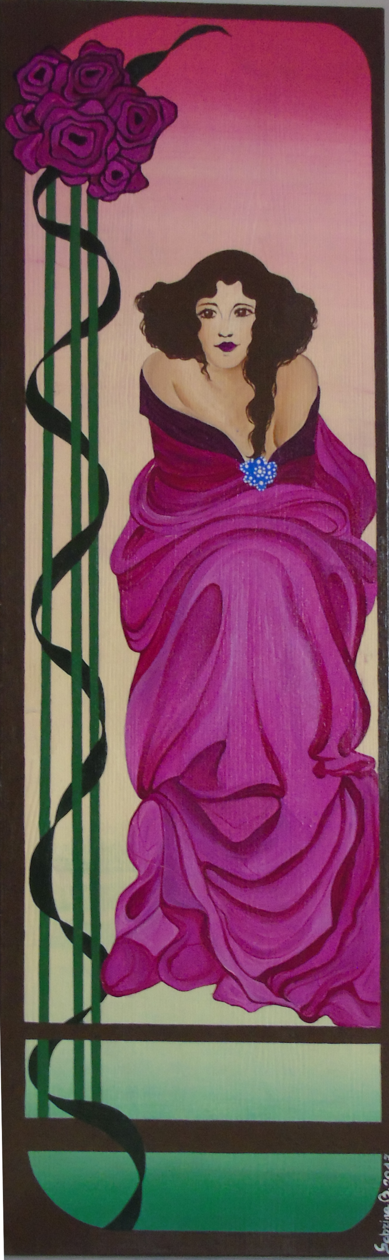 Rappresentazione su pannello in legno d\'abete, di una figura femminile seduta, avvolta da un abito rosa scuro, dipinto in acrilico dai colori brillanti, in stile liberty |