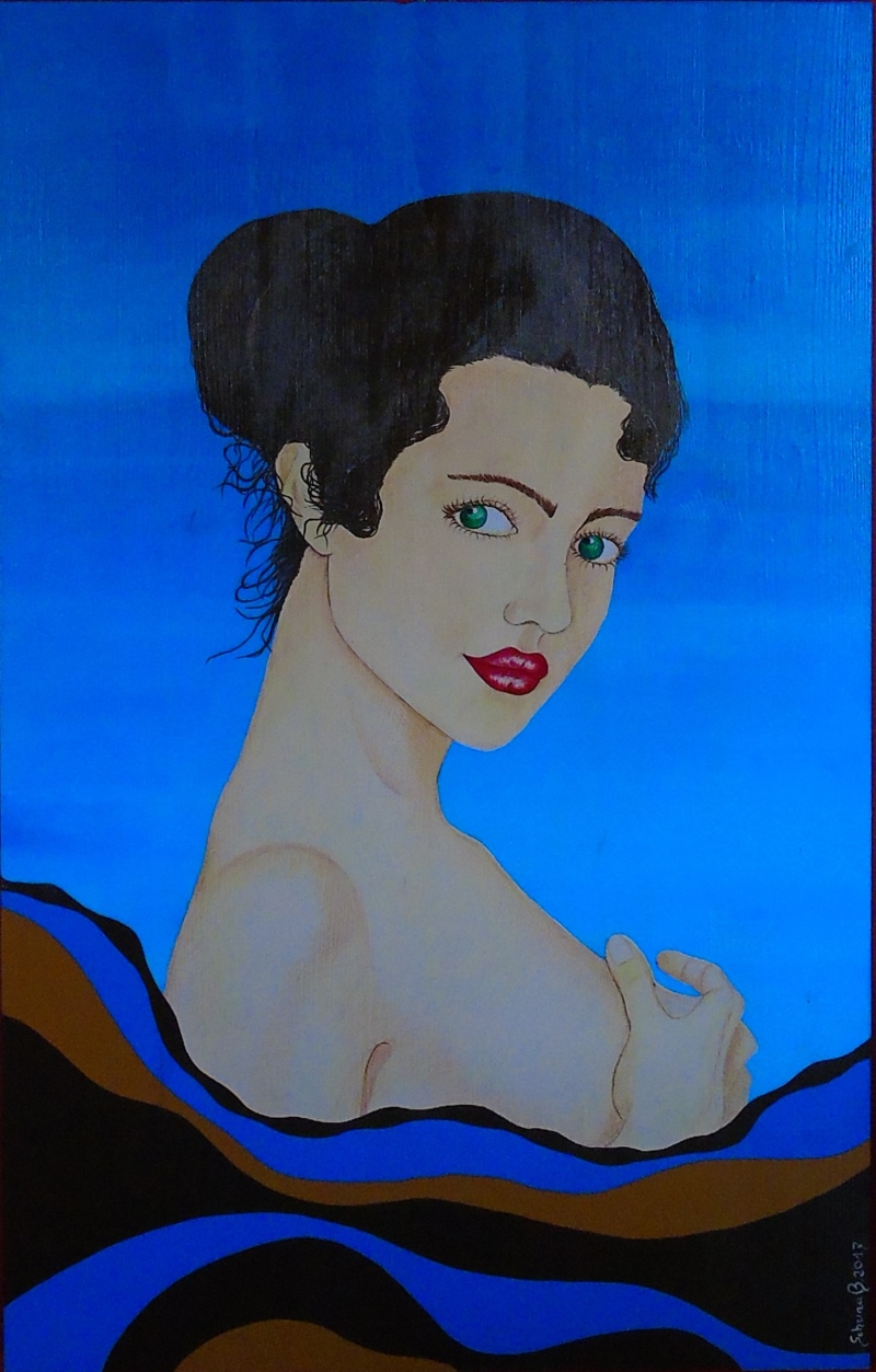 Rappresentazione su pannello in abete, di una figura femminile seduta in abito azzurro, dipinta in acrilico dai colori brillanti in stile liberty |
