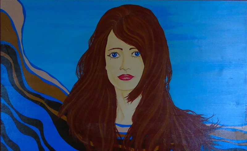 Rappresentazione di una giovane donna, dallo sguardo pensieroso, realizzato su pannello di legno in abete, con colori acrilici e pastelli. |