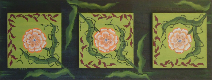 Applicazione di tre riquadri in legno su pannello, motivo floreale con grandi margherite blu e delicati ricami intrecciati |