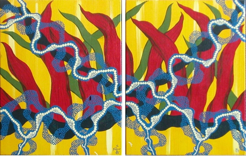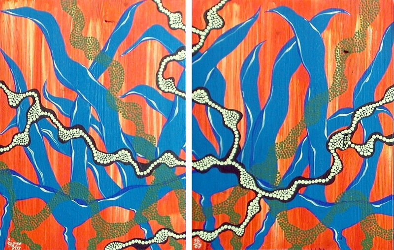 surreale paesaggio di foglie azzurro intenso su sfondo arancio, con suggestioni aborigene e giochi di livello ad effetto tridimensionale |