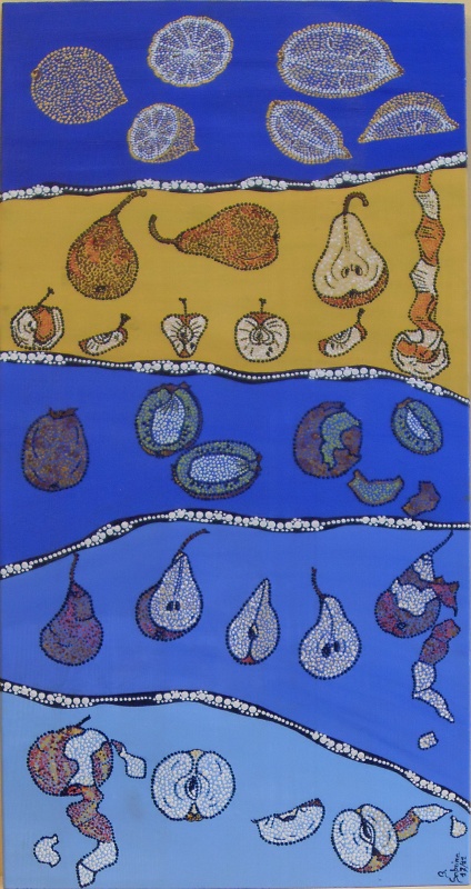 Natura morta con frutta dipinta con tecnica del puntinismo.