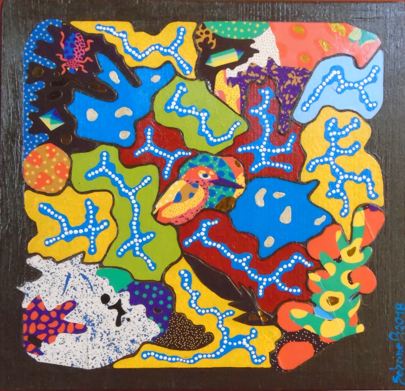 Realizzazione su pannello in legno di abete di disegni multicolore, con assemblaggio di figure di carta, ispirazione dall\'arte aborigrna, realizzato in acrilico.