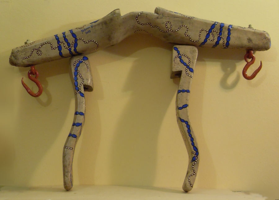 Giogo in legno originale, riadattato ad oggetto di arredamento, impreziosito con decori dipinti a mano |