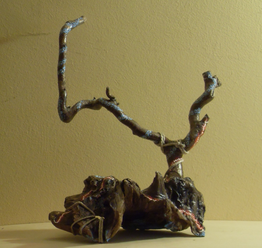 Incastro di vecchie radici di vigneto, fissate mediante corda e viti, e abbellito con un decoro a catenella |