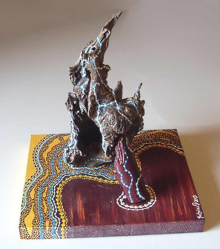 Composizione su piano in legno d\'abete dipinto in acrilico, su fondo in parte e in parte puntinato; sulla base è fissata una curiosa radice dalla forma appuntita, decorata con trecce colorate, mantenendo integro il suo colore naturale |