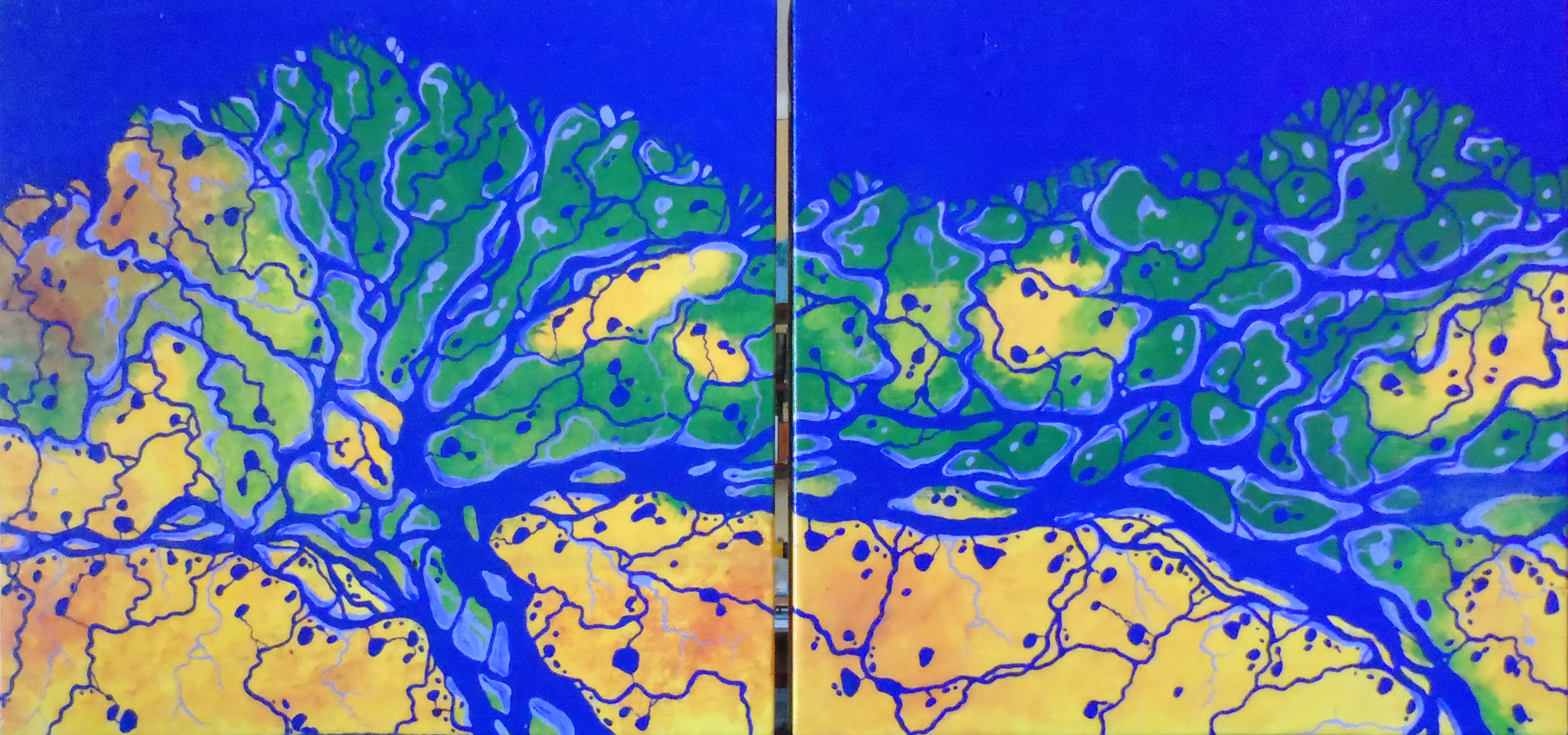 \"fiumi siberiani\",quadro formato da 2 pannelli in abete 33 x 33, su sfondo sfumato di giallo verde e viola, colore che rappresenta mare fiumi e semplici corsi d\'acqua, in una vista aerea. |