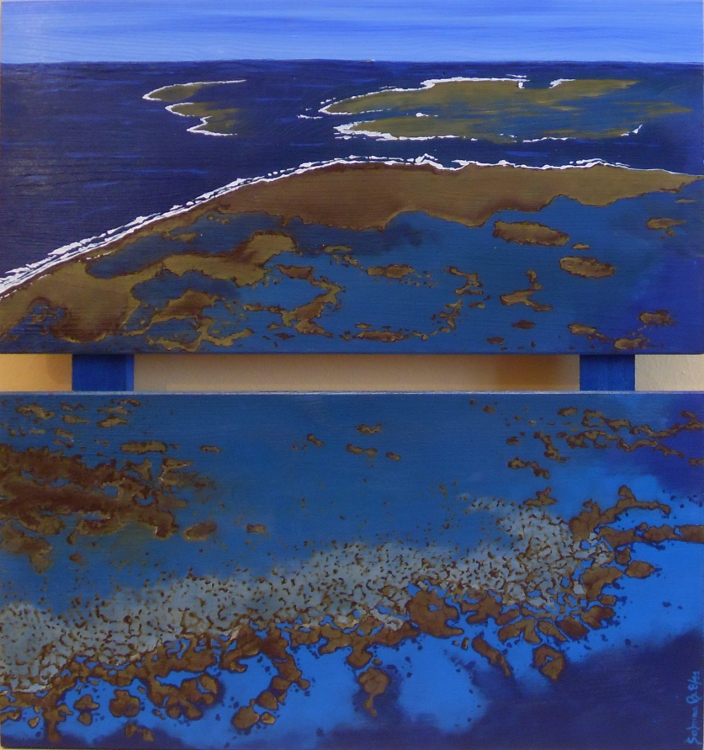 \"la stagione delle piogge\" ,quadro formato da 3 pannelli 33 x 33 in legno di abete, su fondo azzurro , con disegno celeste ombreggiato di viola. Il tutto rappresenta innumerevoli fiumi e corsi d\'acqua in una vista aerea. |