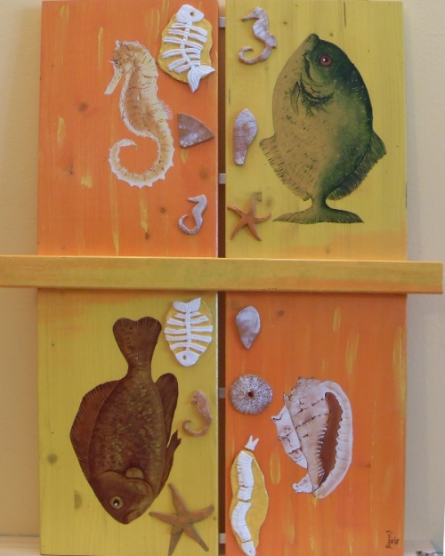 Quadro realizzato con tecnica mista, colori acrilici e applicazioni in das raffiguranti pesci, molluschi ed altre creature marine |