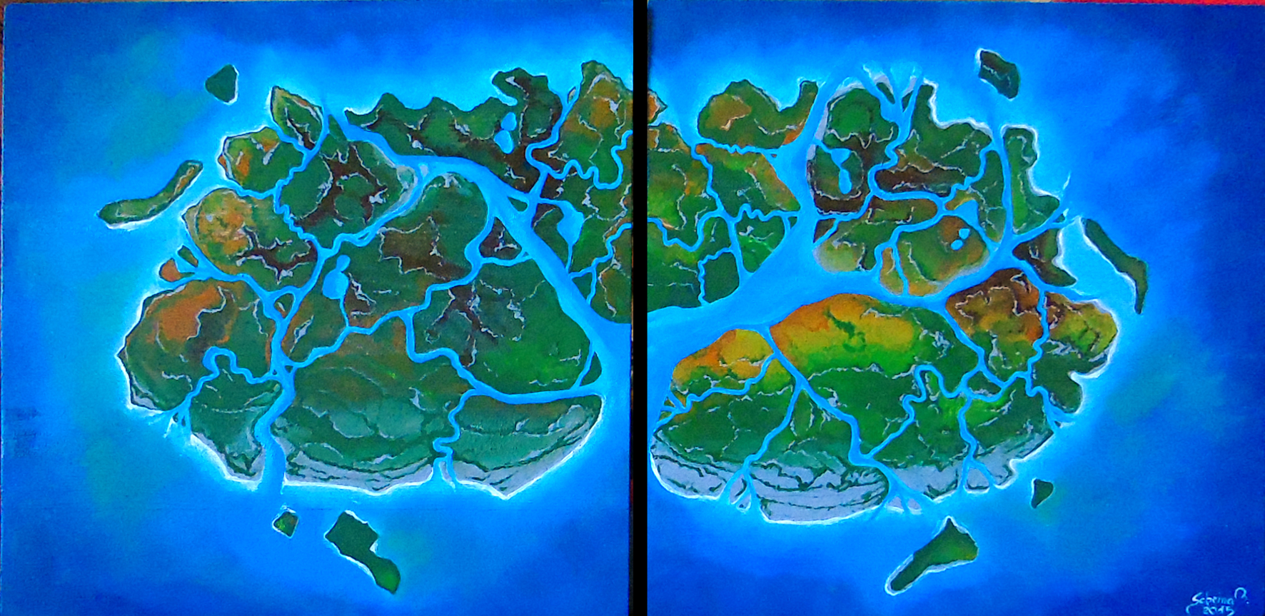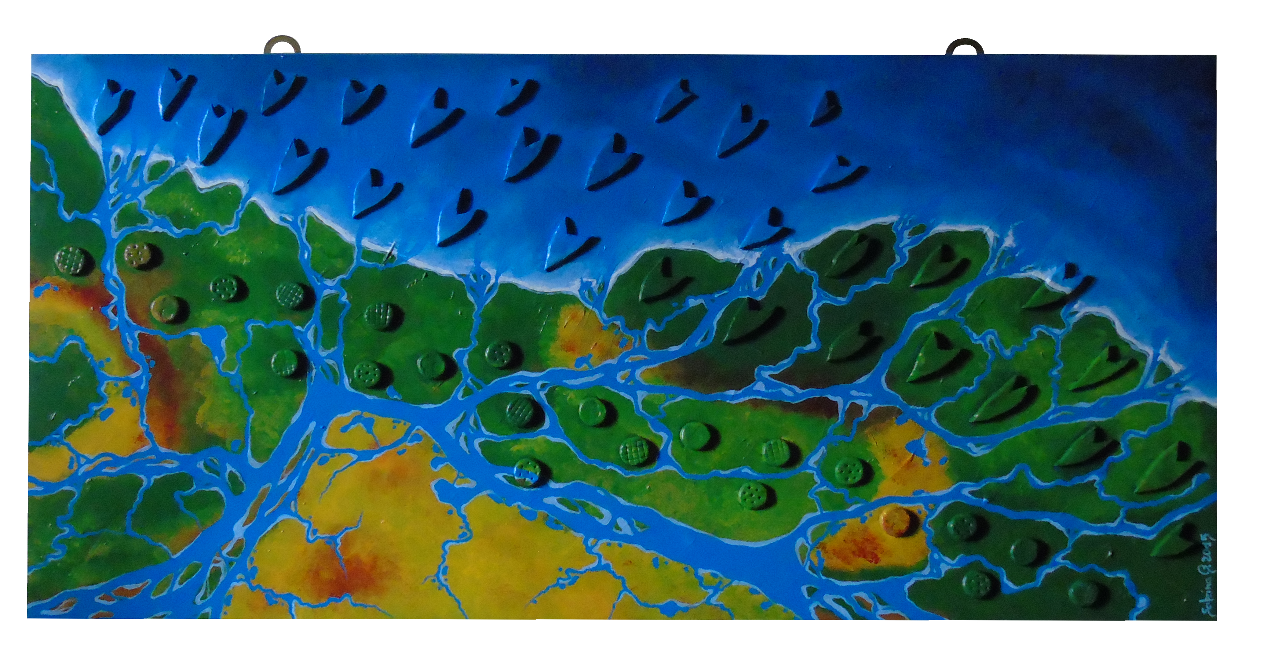Quadro in legno di abete 40 x 80, dipinto in acrilico con colori brillanti di varie tonalità di azzurro verde e giallo, rappresenta una vista aerea di un paesaggio fantasioso, con un grande fiume ed affluenti tra colline e laguna |