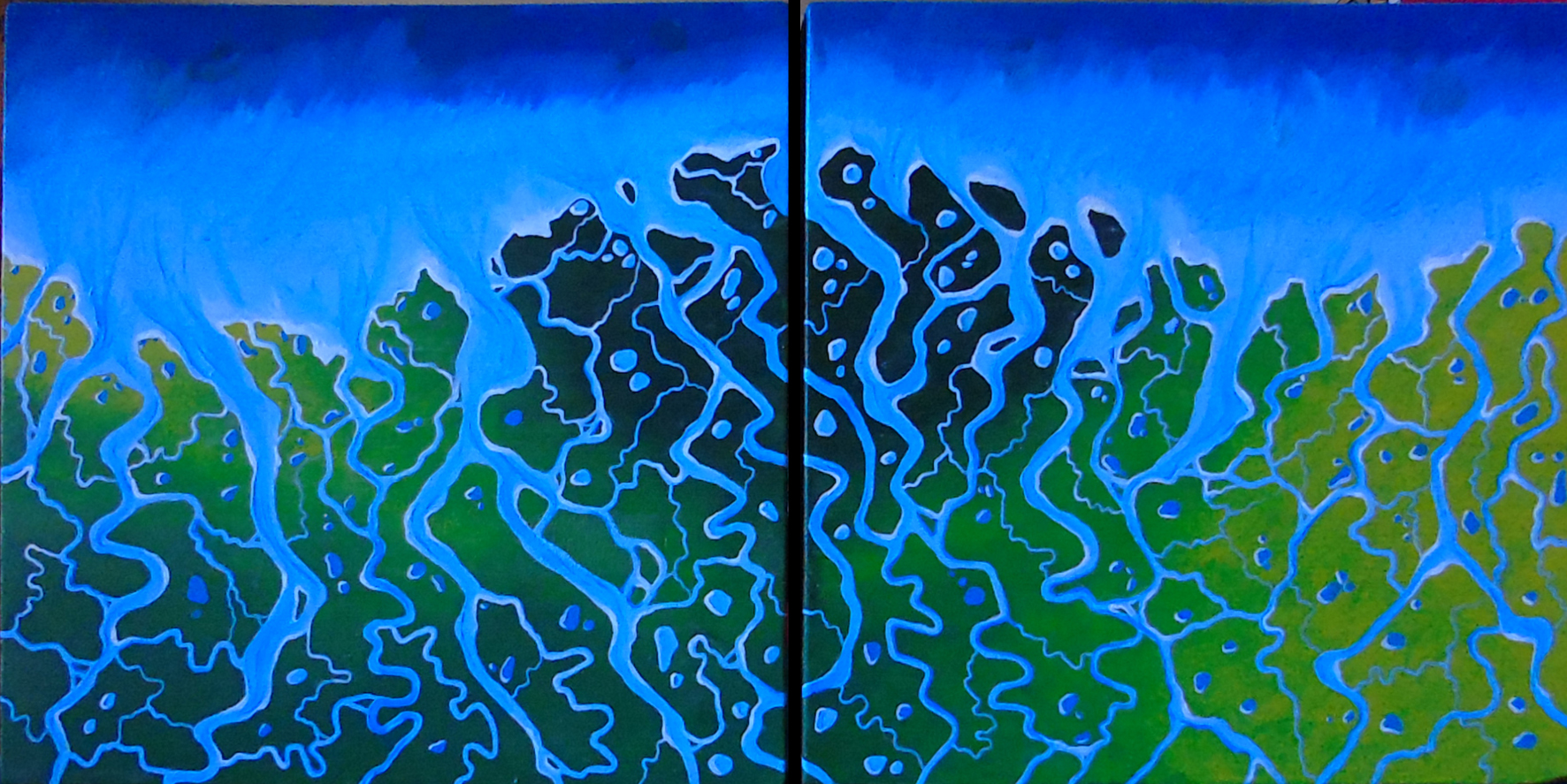 \"fiumi e mare\", quadro formato da 2 panneli in abete 33 x 33, su sfondo verde chiaro e scuro collinare, il colore azzurro e blu rappresenta mare e fiumi che scorrono sulla collina, in una vista aerea. |