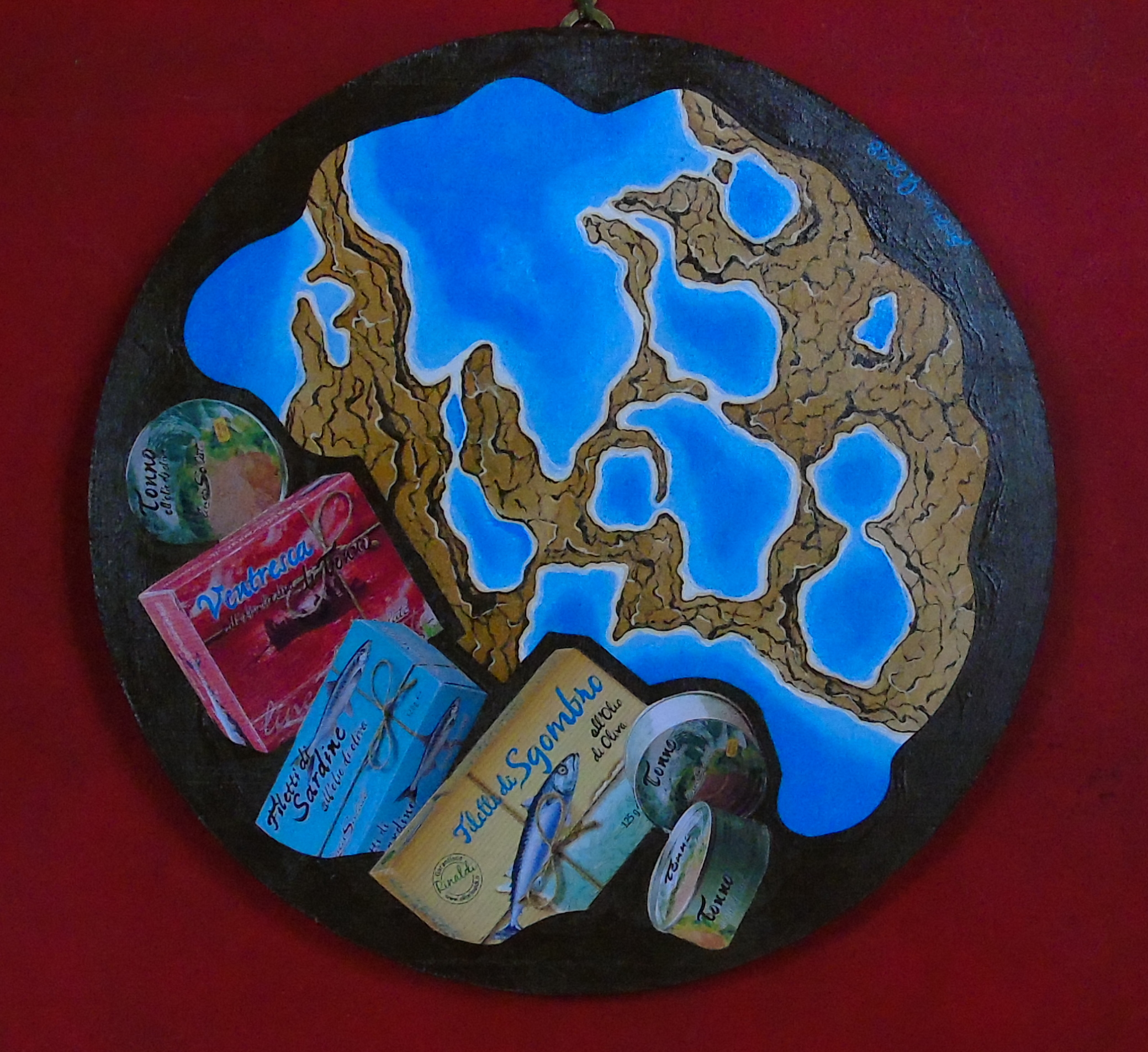 Rappresentazione su pannello in legno di forma rotonda, di una vista aerea marina, immaginaria, con inserimento fotografico di prodotti in vasetto, frutti del mare, realizzato in acrilico dai colori brillanti. |