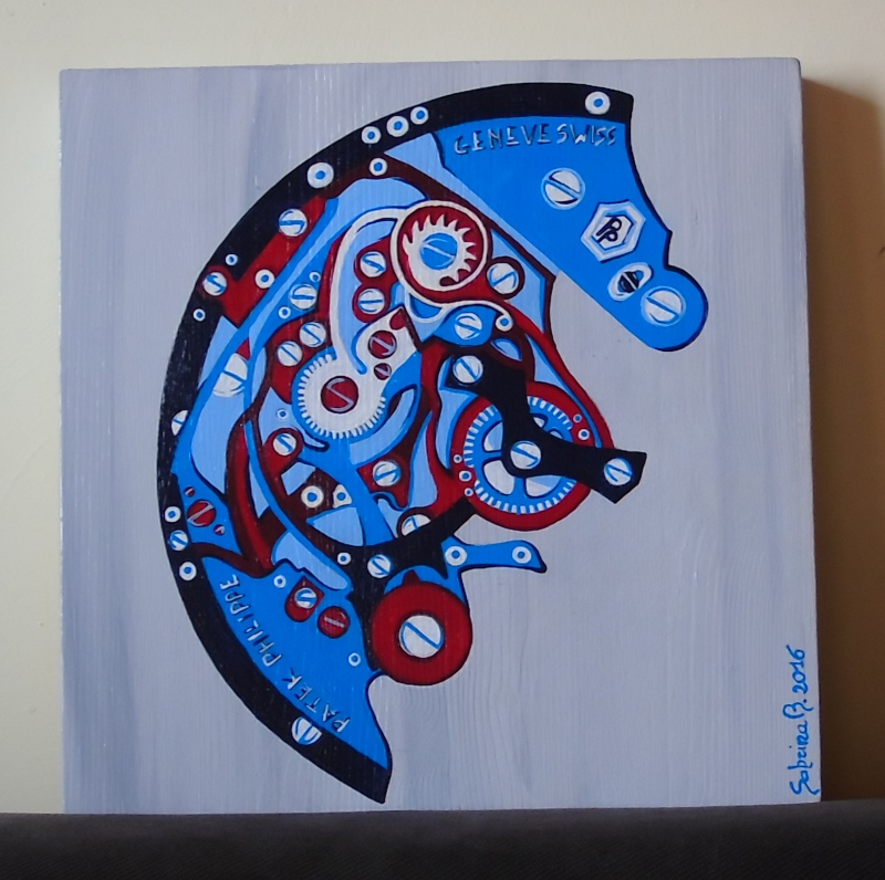 Opera realizzata su legno d\'abete,in acrilico e smalto, raffigurante il meccanismo ingrandito di orologio da polso, gli elementi sono dipinti con colori brillanti. |