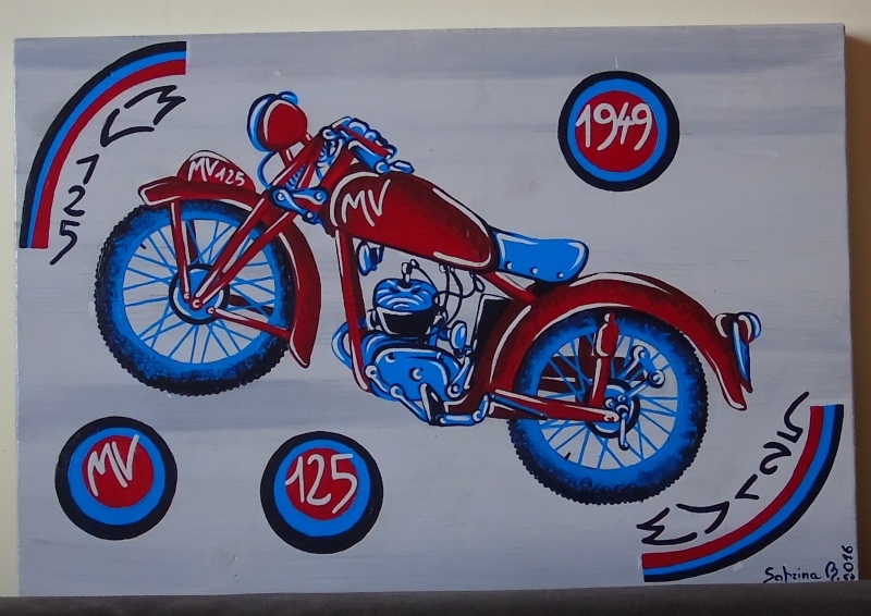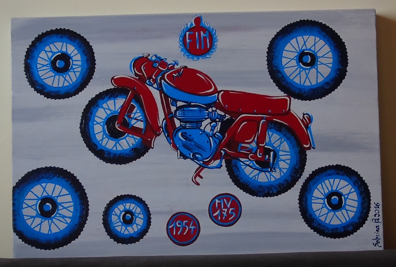 Opera realizzata su legno d\'abete in acrilico e smalto, si rappresenta una moto del 1954 la MV 175, dai colori brillanti |