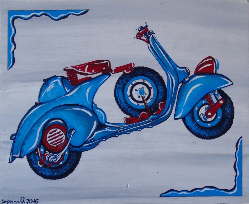 Rappresentazione su pannello di legno di una Vespa Piaggio anni 50, realizzata in acrilico di colore azzurro brillante |