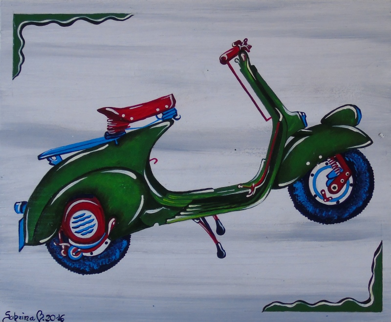 Rappresentazione su pannello di legno di una Vespa Piaggio anni 50, realizzata in acrilico di colore verde brillante |