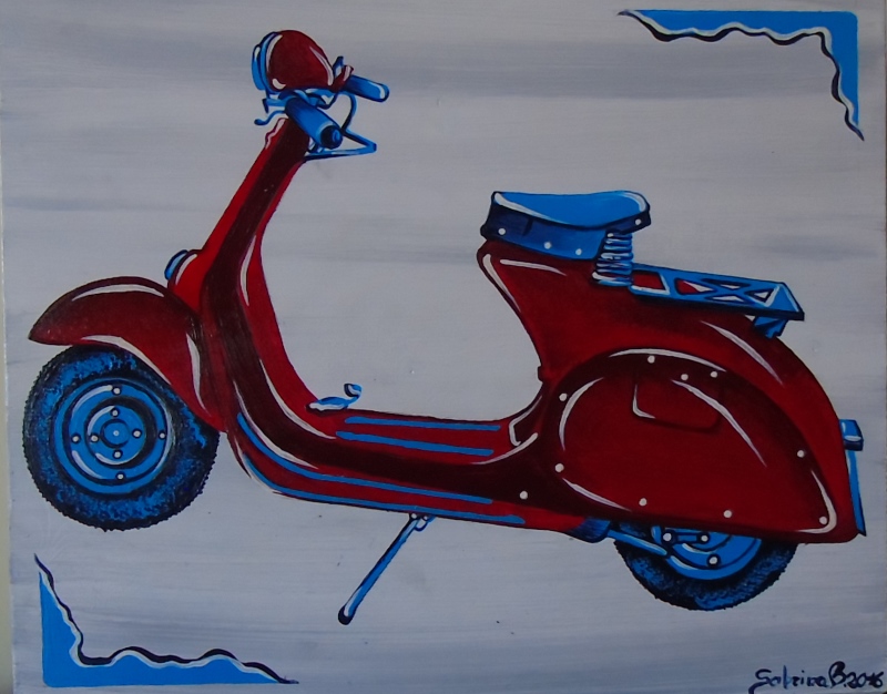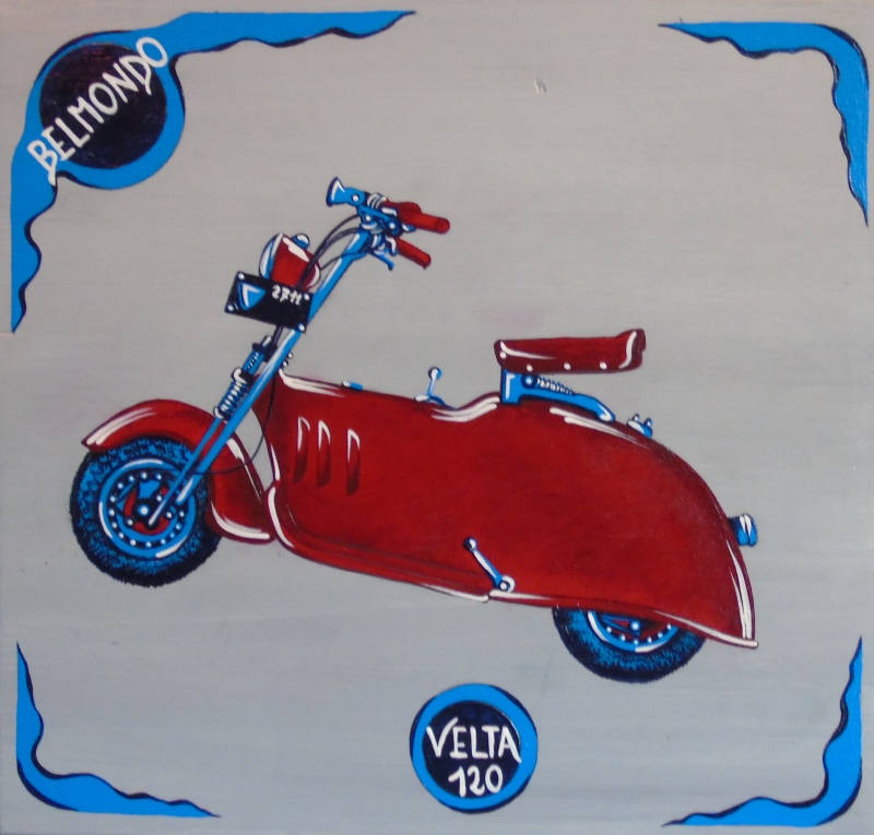 Rappresentazione su pannello in legno d\'abete di uno scooter ditta Belmondo detto Velta 120, dipinto in acrilico di colore rosso. |
