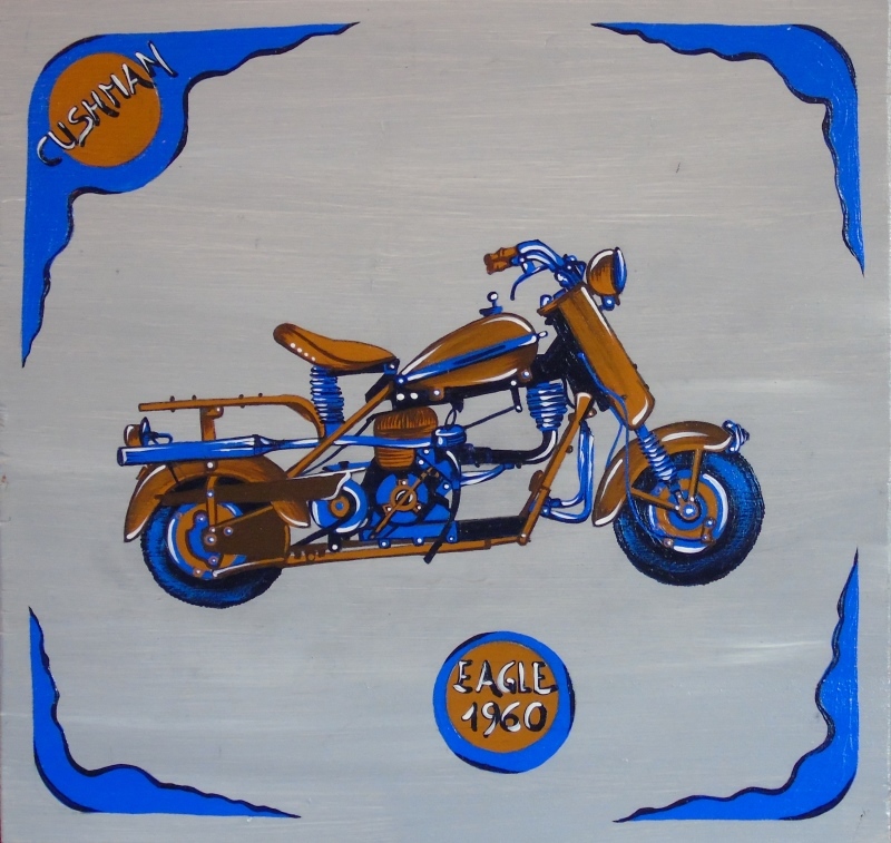 Rappresentazione su pannello in legno d\\\'abete di uno scooter ditta Cushman del 1960, dipinto in acrilico dai colori brillanti. |