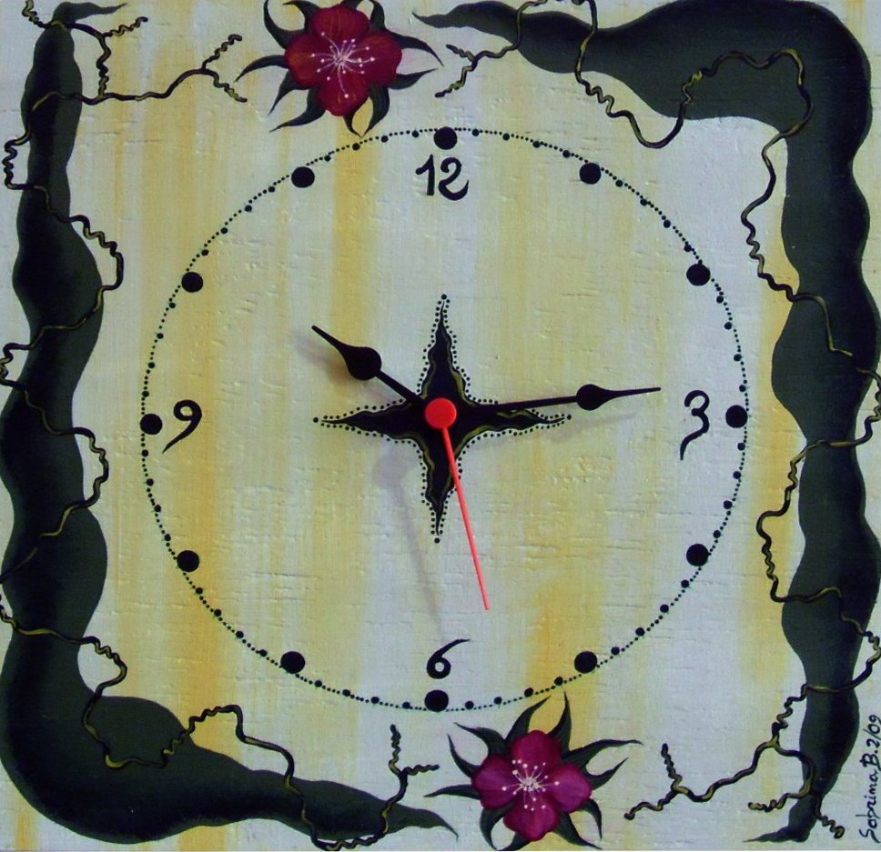 Orologio dipinto su legno con colori acrilici.