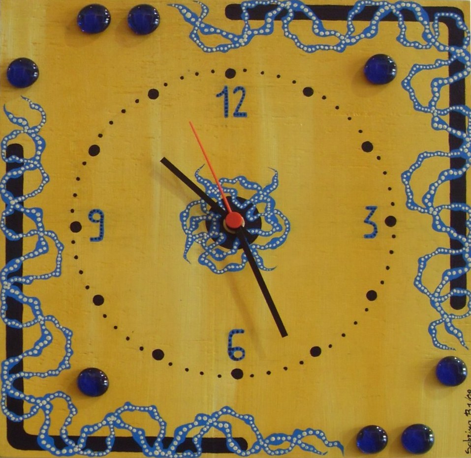 Orologio dipinto con acrilici su legno. Decorazioni azzurre e applicazioni di gocce in vetro blu su sfondo giallo |