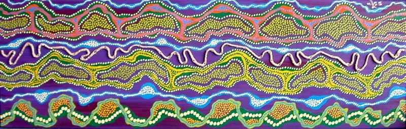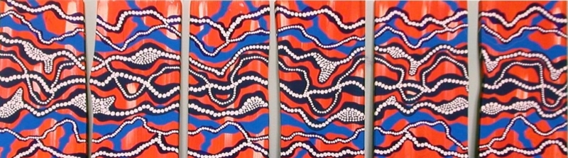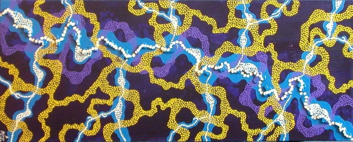 dipinti ispirati alle famose pitture dell'arte aborigena, rappresentanti le misteriose mappe del territorio cantate nelle 'vie dei canti' - le songlines rese celebri da Bruce Chatwin |