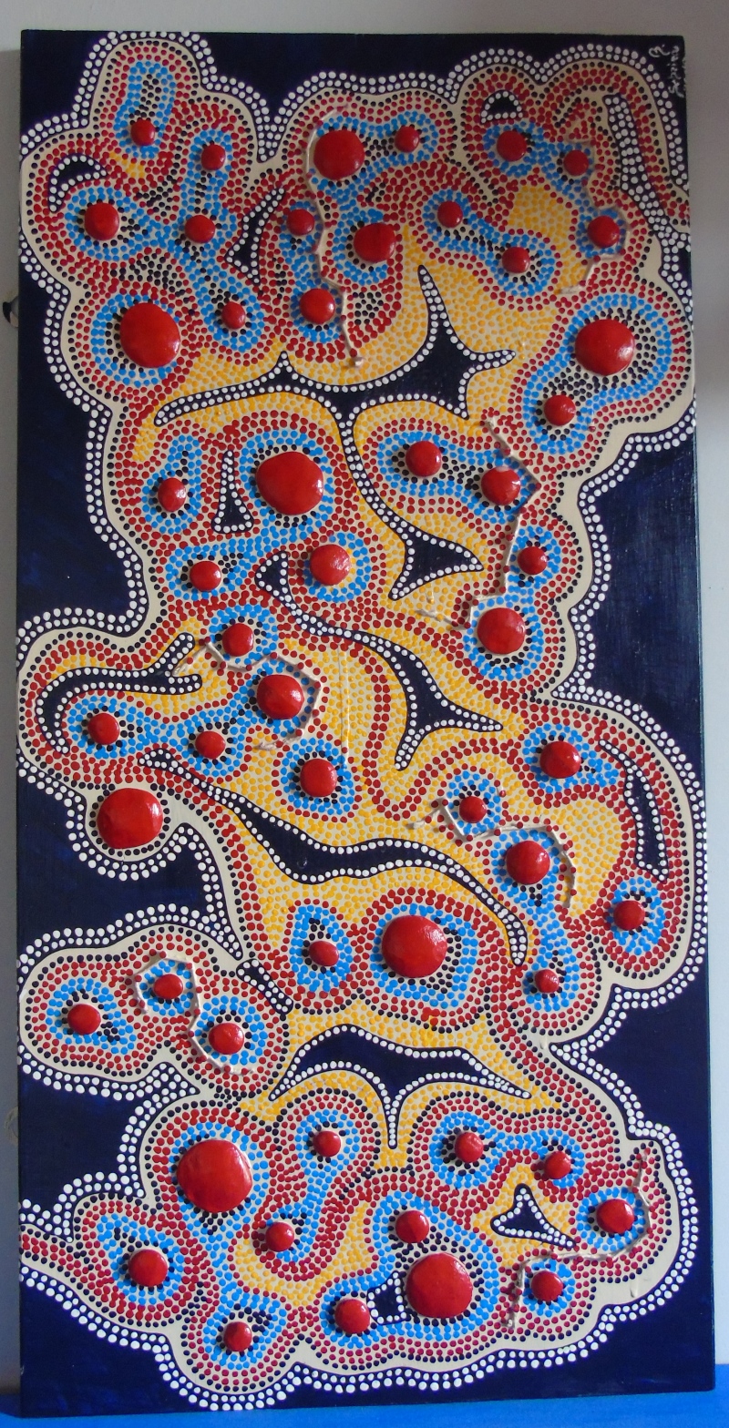 Realizzazione su pannello in legno, di un\'opera realizzata in acrilico, stile aborigeno forme circolari. |