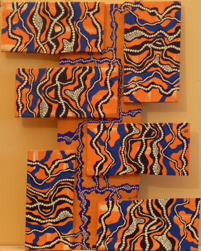 Composizione ispirata dalle pitture degli aborigeni australiani, realizzata con sovrapposizioni di rettangoli in legno |